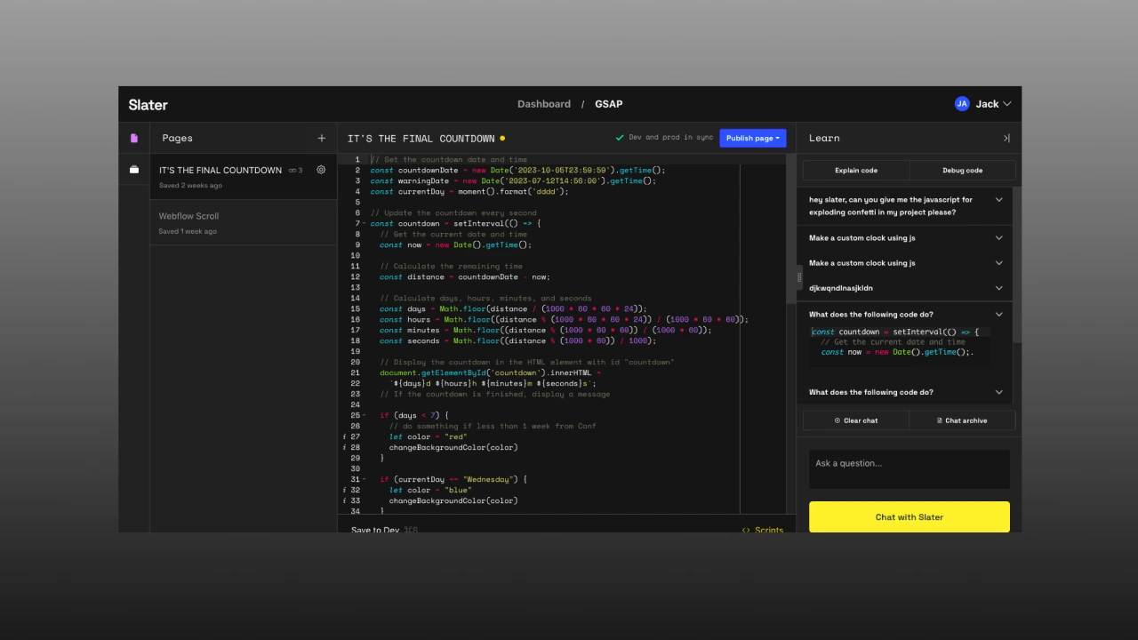 We love Webflow. But we don’t love adding custom code in Webflow. That’s why we made Slater — a code editor that harnesses the power of AI so you can take your projects to the next level.